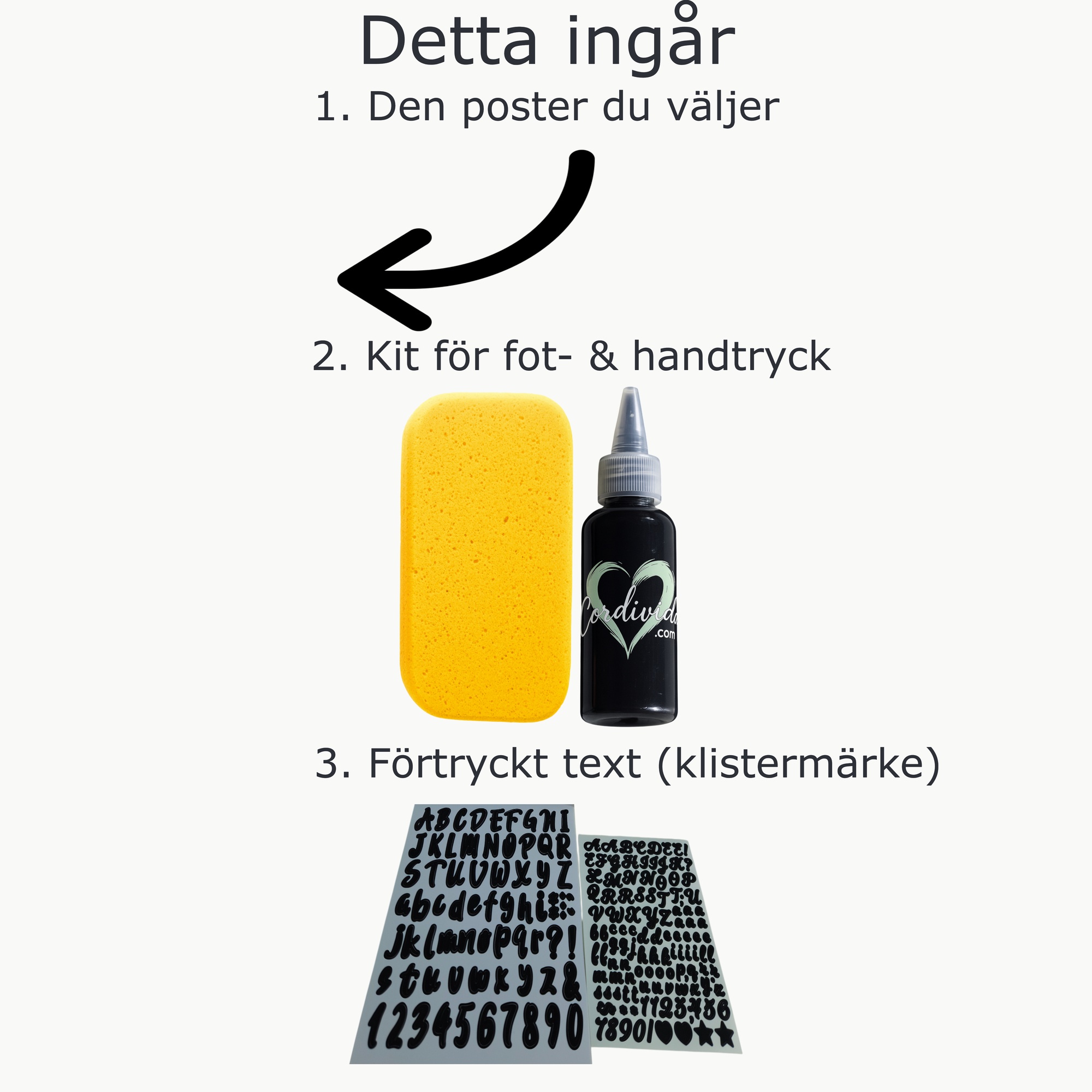 Den vattenbaserade färgen är helt fri från skadliga ämnen och skonsam mot barnets känsliga hud. Den är lätt att tvätta bort, enkel att använda och ger ett jämnt resultat utan kladd. Postern finns i två storlekar – A4 (21x29,7cm) och A3 (29,7x42cm) – vilket gör det lätt att välja det format som passar bäst i ditt hem. När avtrycken har torkat kan du rama in tavlan och skapa ett minne som varar hela livet.